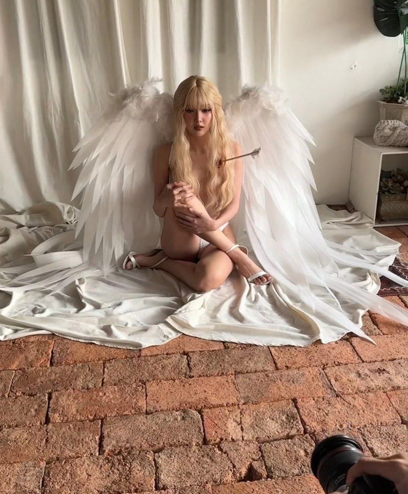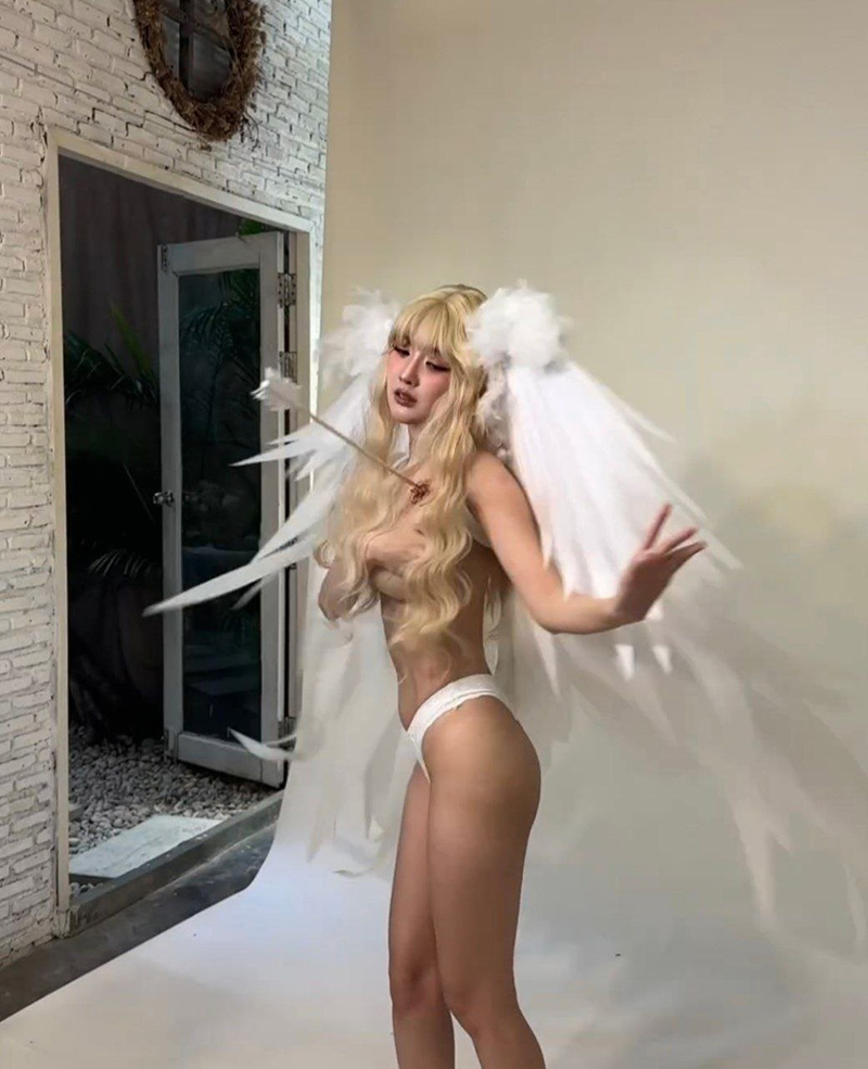 ในภาพชุดนี้ เบียร์ เดอะวอยซ์ มาในลุคสาวผมบลอนด์สุดแซ่บ สวมปีกนางฟ้าขนาดใหญ่ อวดหุ่นสวยในชุดชั้นในสีขาวสุดเซ็กซี่ ท่อนบนเปลือยอก พร้อมพร็อพศรรักปักอกที่เข้ากับบรรยากาศวันวาเลนไทน์ได้อย่างลงตัว