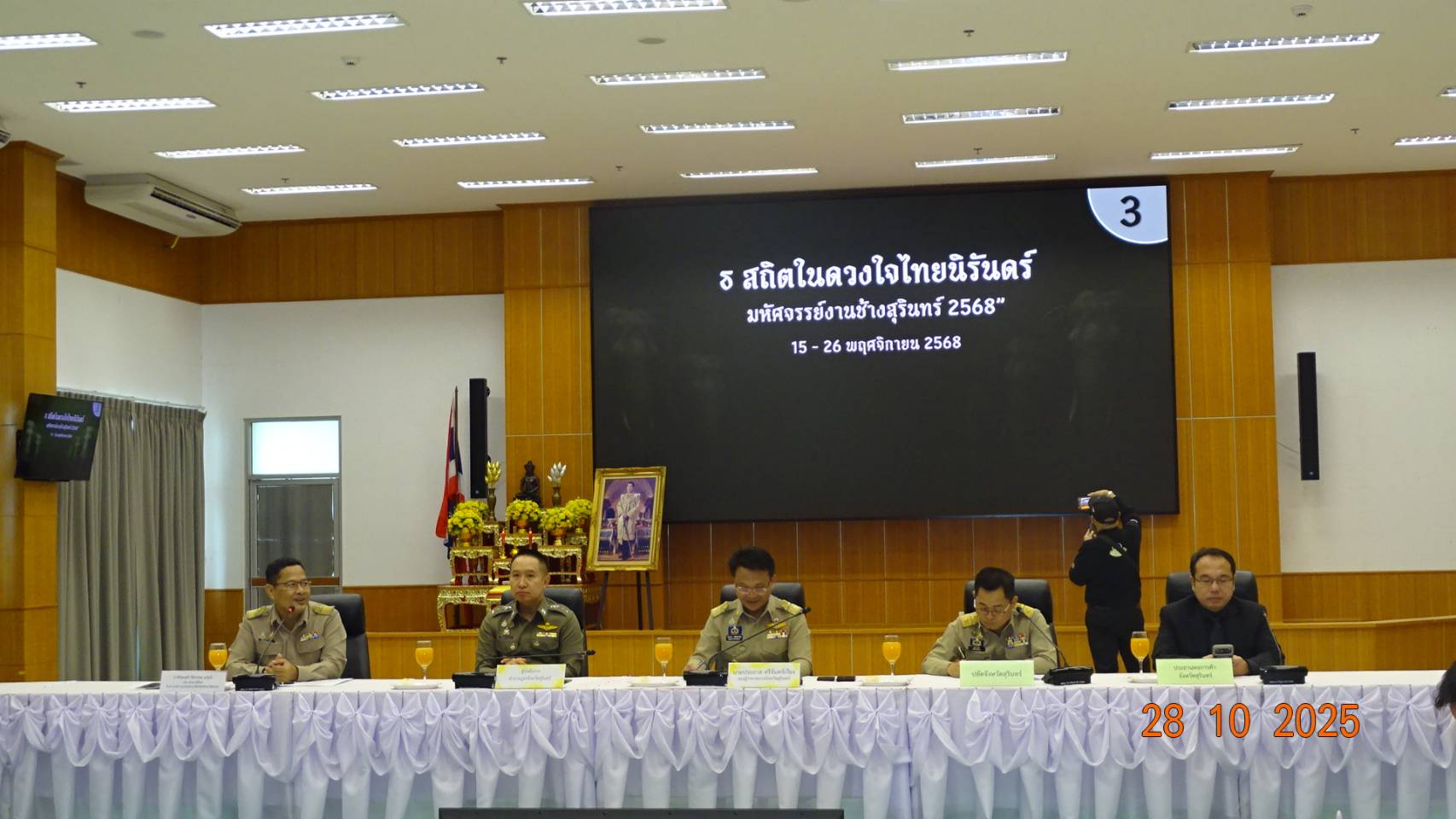 เมื่อวันที่ 28 พฤศจิกายน 2568 เวลา 11.30 น. ณ ห้องประชุมช้างใหญ่ ชั้น 4 ศูนย์ราชการจังหวัดสุรินทร์ นายประภาส ศรีจันทร์เวียง รองผู้ว่าราชการจังหวัดสุรินทร์ รักษาราชการแทนผู้ว่าราชการจังหวัดสุรินทร์ พร้อมด้วย ปลัดจังหวัดสุรินทร์ รองผู้บังคับการตำรวจภูธรจังหวัดสุรินทร์ หัวหน้าส่วนราชการ ภาคเอกชน ภาคีเครือข่าย และสื่อมวลชนร่วมงานแถลงข่าวฯ ในปี พ.ศ. 2568 โดย จังหวัดสุรินทร์ ได้กำหนดให้มีการจัดงาน ... ธ สถิตในดวงใจไทยนิรันดร์ “มหัศจรรย์งานช้างสุรินทร์ 2568” เพื่อน้อมรำลึกในพระมหากรุณาธิคุณ และถวายอาลัยพระพันปีหลวง จึงได้กำหนดจัดงานแสดงของช้างฯ ในวันที่ 22 และ 23 พฤศจิกายน 2568 ณ สนามแสดงช้างจังหวัดสุรินทร์ ตำบลนอกเมือง อำเภอเมืองสุรินทร์ จังหวัดสุรินทร์ โดยการแสดงความน่ารักและแสนรู้ของช้าง ที่ยังคงรักษาความโดดเด่นทางด้านขนบธรรมเนียม ประเพณี ศิลปวัฒนธรรม และความเป็นอัตลักษณ์ชาวเขมร กูย และลาว โดยได้มีการผสมผสานการแสดงด้านศิลปวัฒนธรรมประเพณีลงในฉากการแสดงของช้าง เพื่อเล่าเรื่องราวความเป็นมาของชาวสุรินทร์ การแสดงถึงวิถีชีวิตความผูกพันระหว่างช้างกับชาวสุรินทร์ การจำลองพิธีกรรมเกี่ยวกับการเลี้ยงช้าง การแสดงการชนช้างที่สมจริงสมจังมากที่สุด รวมทั้งมีการรวมตัวของช้างในสนามที่มากกว่า 150 เชือก