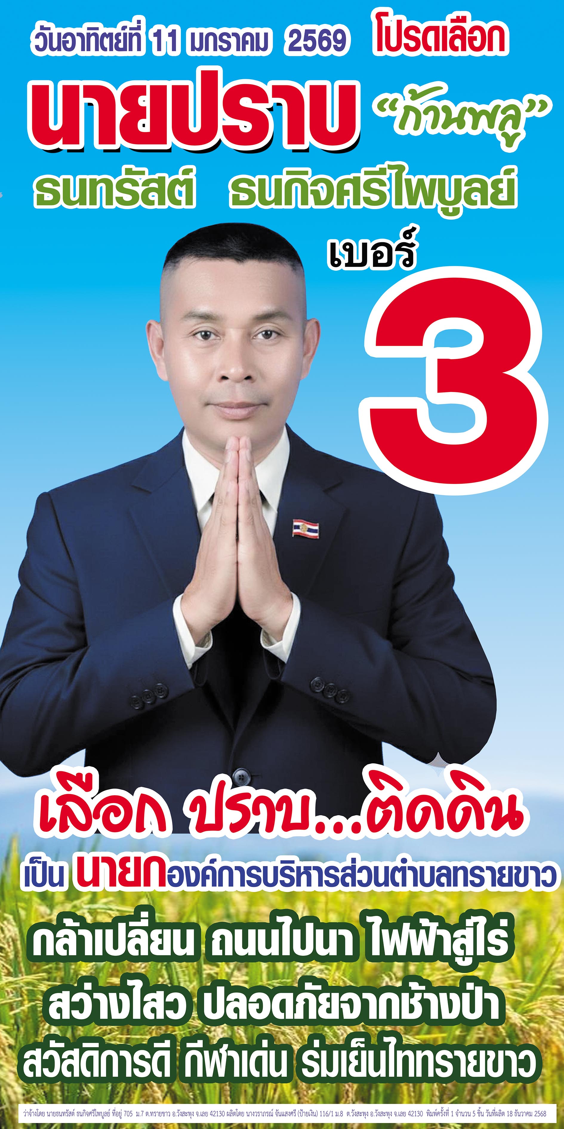 วันนี้ทีมสกู๊ปข่าวส่องการเมืองท้องถิ่น ขอพาไปส่องการแข่งขันเลือกตั้งนายกองค์การบริหารส่วนตำบลทรายขาว อำเภอวังสะพุง จังหวัดเลย และขอส่องโฟกัสไปที่นายธนทรัสต์ ธนกิจศรีไพบูลย์ (ปราบ) ผู้ลงสมัครแข่งขันเป็นนายกองค์การบริหารส่วนตำบลทรายขาว เบอร์ 3 เพระเห็นดีกรีประวัติการทำงานที่ผ่านมาไม่ธรรมดา ธนทรัสต์ ธนกิจศรีไพบูลย์ เกิดที่บ้านโพนงาม ตำบลทรายขาว อำเภอวังสะพุง จังหวัดเลย -เรียนชั้นประถมศึกษาโรงเรียนบ้านโพนงาม -เรียนชั้นมัธยมศึกษาปีที่ 1-6 โรงเรียนศรีสงครามวิทยา -เรียนชั้นอนุปริญญาที่มหาวิทยาลัยราชภัฏเลย คณะเทคโนโลยีการเกษตร -และเรียนชั้นปริญญาตรี ที่สถาบันมหาวิทยาลัยราชภัฏเพชรบุรีวิทยาลงกรณ์ในพระบรมราชชูปถัมภ์ คณะวิทยาการและการจัดการทั่วไป นายธนทรัสต์ ธนกิจศรีไพบูลย์ จึงเป็นคนตำบลทรายขายโดยกำเนิด -ประวัติการทำงาน -ทำงานในบริษัทเอกชนในเขตอุตสาหกรรมหลายปี -ทำงานที่ธนาคารซิตี้แบงค์แห่งประเทศไทย -ทำงานที่บริษัท Outsource ด้านสินเชื่อและบัตรเครดิต -เป็นประธานคณะกรรมการจัดตั้ง พ.ร.บ.พืชเศรษฐกิจแห่งชาติจังหวัดเลย -เป็นรองประธานกลุ่มเกษตรกรไทย(กกท.) -ปัจจุบันเป็นคณะอนุกรรมการกองทุนฟื้นฟูและพัฒนาเกษตรจังหวัดเลย