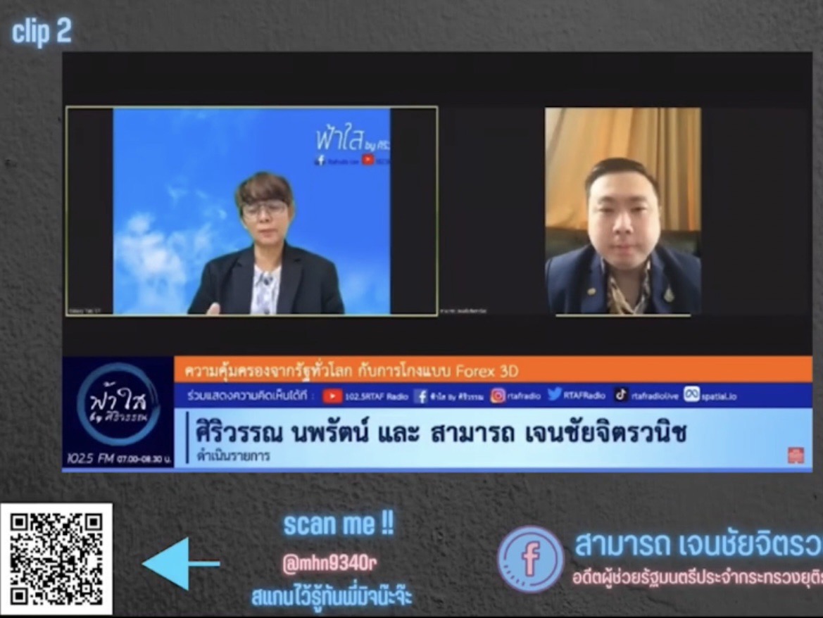 วันที่ 22 ก.ย.2565 เวลา 08.00 น.นายสามารถ เจนชัยจิตรวนิช อดีตผู้ช่วยรัฐมนตรีว่าการกระทรวงยุติธรรม และ ประธานสมาพันธ์ต่อต้านแชร์ลูกโซ่แห่งประเทศไทย ได้ถูกเชิญมาร่วมพูดคุยในเรื่อง กลโกงแชร์ลูกโซ่ Forex 3D ต่อเนื่องจากครั้งก่อน ทางรายการฟ้าใส By ศิริวรรณ ช่องรายการวิทยุกองทัพอากาศ ที่มี คุณปุ้ม ศิริวรรณ นพรัตน์ เป็นผู้ดำเนินรายการโดยทั้งสองได้พูดคุยต่อเนื่องจากครั้งที่แล้วในเรื่องกฏหมายประเทศไทยที่คนสมัยรัชกาลที่ 5 ฟื้นขึ้นมาคงสงสัยว่าทำไมกฏหมายยังคงแทบไม่เปลี่ยนแปลง