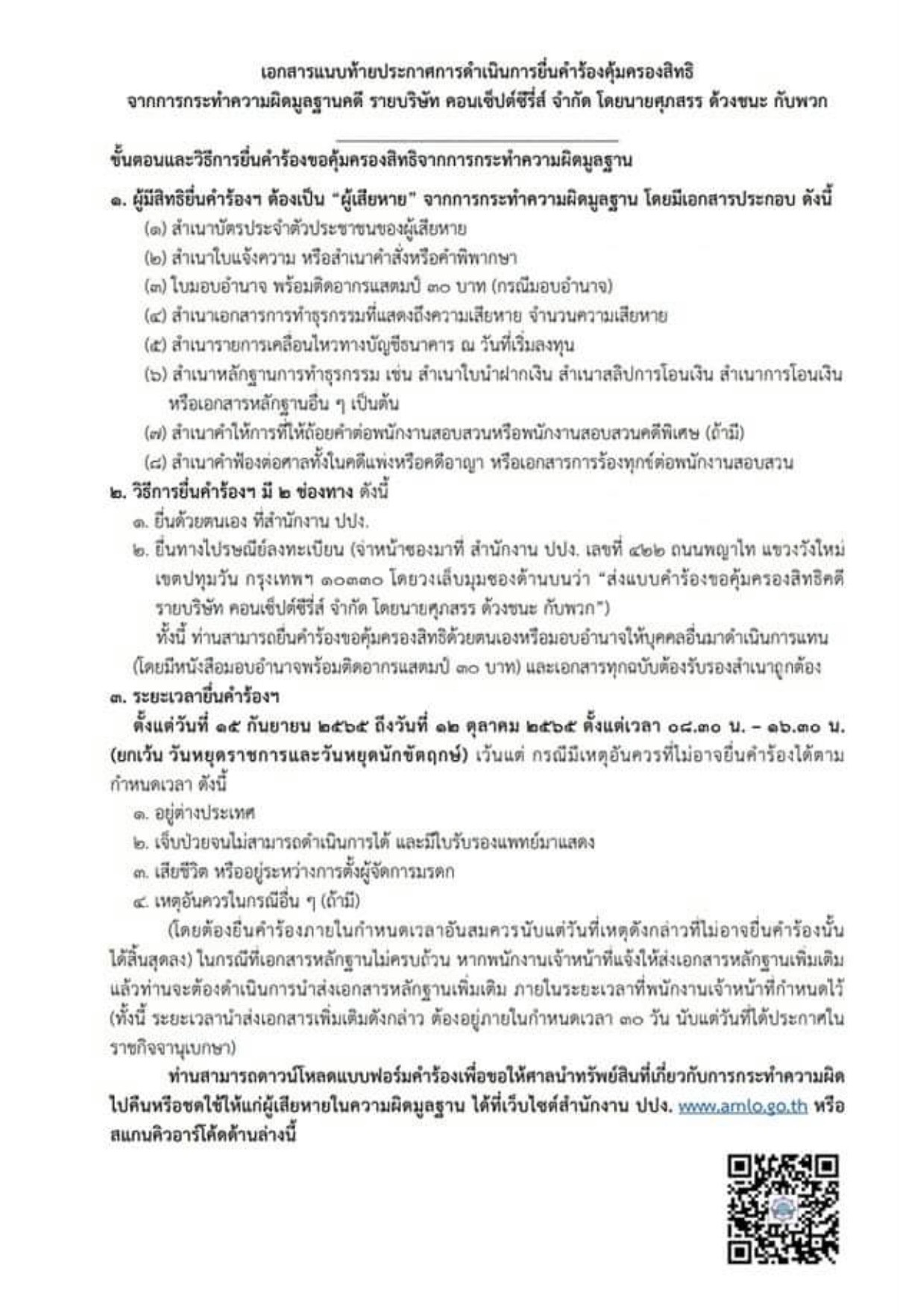 โดยได้แนบเอกสารประกาศการดำเนินการยื่นคำร้องคุ้มครองสิทธิ โดยในเอกสารได้กล่าวว่า จากการกระทำความผิดมูลฐานคดี รายบริษัท คอนเซ็ปต์ซีรี่ส์ จำกัด โดยนายศุภสรร ด้วงชนะ กับพวก