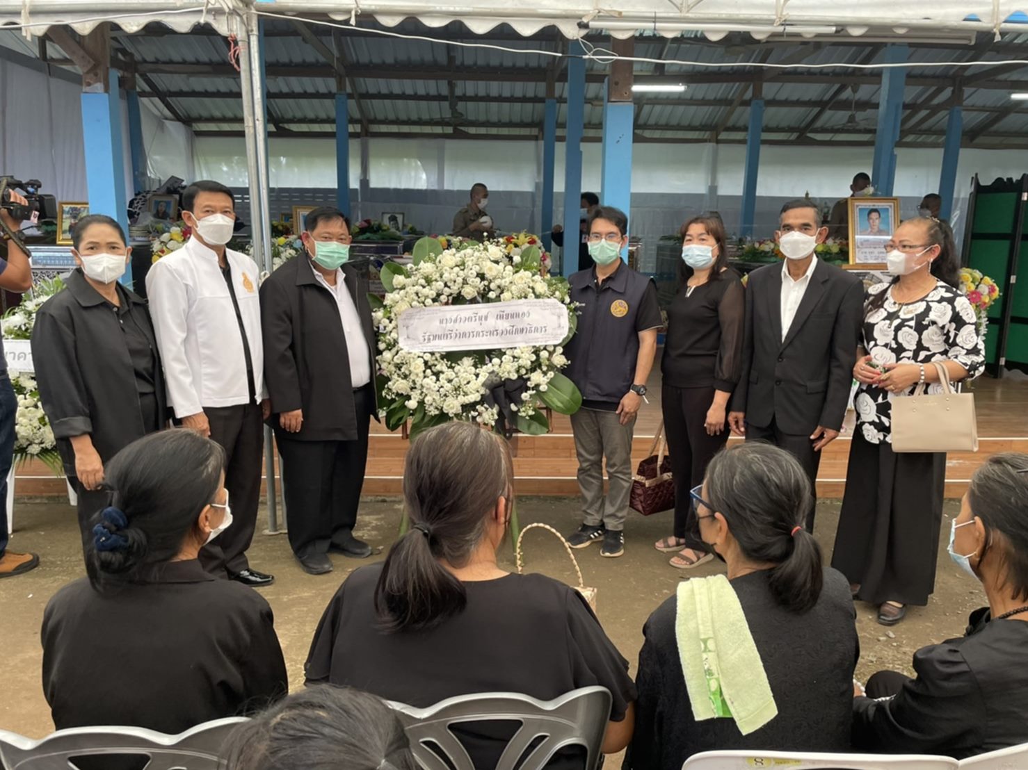 ดร.ธีร์ ภวังคนันท์ ผู้ตรวจราชการ ศธ. เป็นตัวแทนรัฐมนตรีนำพวงหรีดร่วมแสดงความเสียใจแก่เด็กนักเรียนที่เสียชีวิตในเหตุกราดยิง